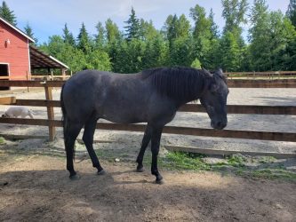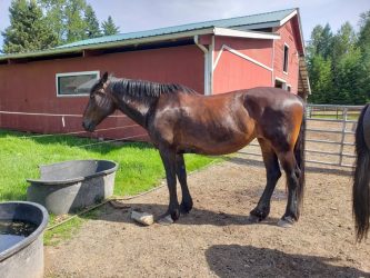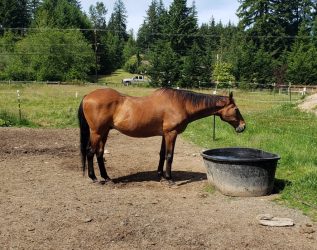 orchard grass hay. He has also never been described as thin. He will be having some alfalfa added to his diet to provide more amino acids in addition to a pound of soybean meal. He is on pasture in the day and has orchard overnight. I am unsure on a horse of his age and growth if he needs more minerals than Redmond salt provides. We are selenium deficient here in WA, which has been drilled into us my entire life by conventional veterinarians.The third horse is the lighter bay, Dusty. He is an upper 20s gelding who has been boarded with me for 4.5 years. His owner is absentee, so he is the bonus fun case study for a diet change. He has had horrendous muscle wastage and swayback since he arrived at my place. He has most of his teeth, but they are very smooth. He held weight last winter on 9-10 lbs of Haystack Special Blend, which is a regional hay blend and fat unfortified feed that also has canola, rice bran and flax. He also received 2 cups of canola a day and he chews on somewhere between 5 and 10 lbs of orchard hay a day. He was receiving much more than the minimum calories for a sedentary horse of his size and has a good fat covering, but his muscles have never come back.