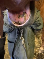Where most people go wrong is that they only have in their mind that they want to look at or photograph or clean (etc) something under the lip. Don’t use these as reasons to lift the lip. Focus, instead, on earning the trust of the horse. Reward when earned and NEVER REWARD BAD BEHAVIOR. An example of this would be, during your attempt of raising the upper lip, the horse rejects your request and you either say “Stand still! I’m not going to hurt you.” or you say nothing but double down on your energy and strength. The result of this is more rejection.