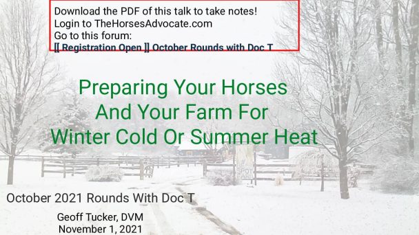 Here is the replay for October 2021’s Rounds With Doc T – “Preparing Your Horses And Your Farm For Winter Cold Or Summer Heat.” Recorded Monday November 1, 2021.
